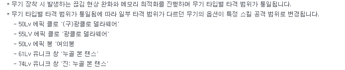 "무기 타입별 타격 범위가 통일되며, 따라서 일부 타격 범위가 다르던 무기의 옵션이 특정 스킬 공격 범위로 변경됩니다" 라는 내용이 있습니다.