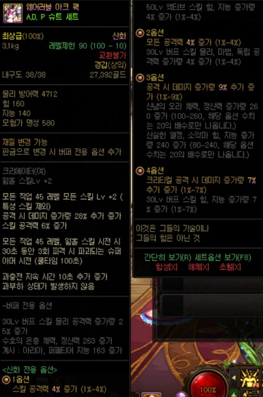 - 일부 스킬 쿨감과 hp, mp max 감소 패널티가 붙은 아이템입니다. 부위에 따라 꽝과 최고의 옵션이 있는 종류이기도 합니다. 마법석의 경우 60렙제 쿨감 10퍼라서 효율이 높고, 신발의 경우 70렙제 쿨감 10퍼라서 사실상 기본 딜 증가 외에 무옵이라고 보셔도 됩니다. 그리고 어께는 45제 쿨감인데 만약 레드메인 어께+사도강림플티 45제+무기 클레압 45제 이렇게 쓰신다면 야망 버리고 기요틴 쓰는걸 진지하게 고려해봐도 됩니다.