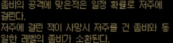 좀비강령은 특수 저주를 유발하는 기능이 있습니다. 이 저주는 좀비의 자폭공격에는 걸리지 않고, 좀비가 물어뜯기한 공격에만 발동됩니다. 저주가 걸리면 일반적인 저주처럼 힘지체정 감소가 붙는게 아닌 틱뎀이 들어가며, 이 저주는 후술할 야행혼의 저주 증뎀 조건에 적용되지 않는 상황입니다. (현재 야행혼 증뎀관련은 버그로 추정됨)