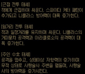 원거리 전투의 경우 위의 움짤처럼 거리를 벌려서 공격하려하며 복종하는 사령으로 니콜라스의 공격력이 증가합니다. 니콜라스를 마스터하여 딜링기로 쓸 경우 사용해야되는 모드이며, 복종하는 사령의 레벨당 증가치가 4퍼나 되서 레벨링 효율이 매우 높습니다.