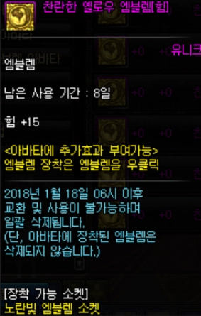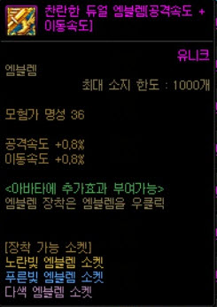 노란빛 엠블렘 소켓에 박을수 있는 엠블렘. 보통은 공속or캐속 엠블을 끼고 있으므로 딜손실 없이 교체 가능하지만 만약 한정 이벤트로 나오는 옐로우 엠블렘을 박고있다면 힘지능을 포기하고 박아야 함. 또는 공속체감이 큰 직업의 경우도 간접적으로 딜로스를 유발할수 있음.