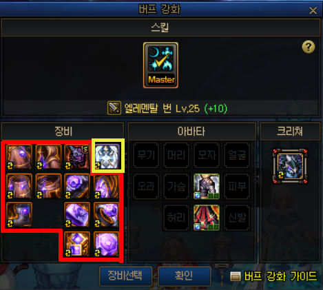 빨간 테두리로 쳐진 버프 강화 장비부터, 노란테두리의 칭호, 크리쳐와 아바타 까지!