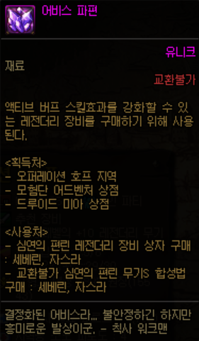 어비스 파편을 마계-할렘의 NPC 세베린에게 가져다 주면 버프 강화 장비로 교환 하실 수 있습니다!
