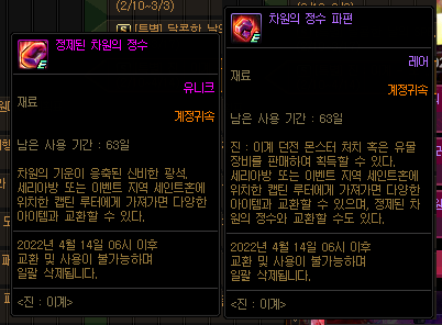 이벤트 재화는 '정제된 차원의 정수', '차원의 정수 파편' 2가지가 있으며