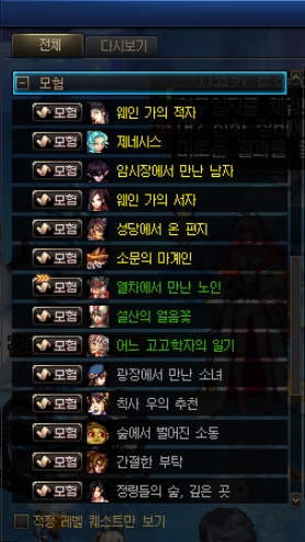 레벨차이가 심하게 나는 퀘스트(회색글씨)는 가려져서 안보이게 되니 참고하세요