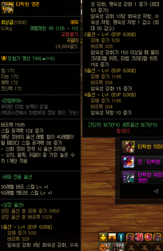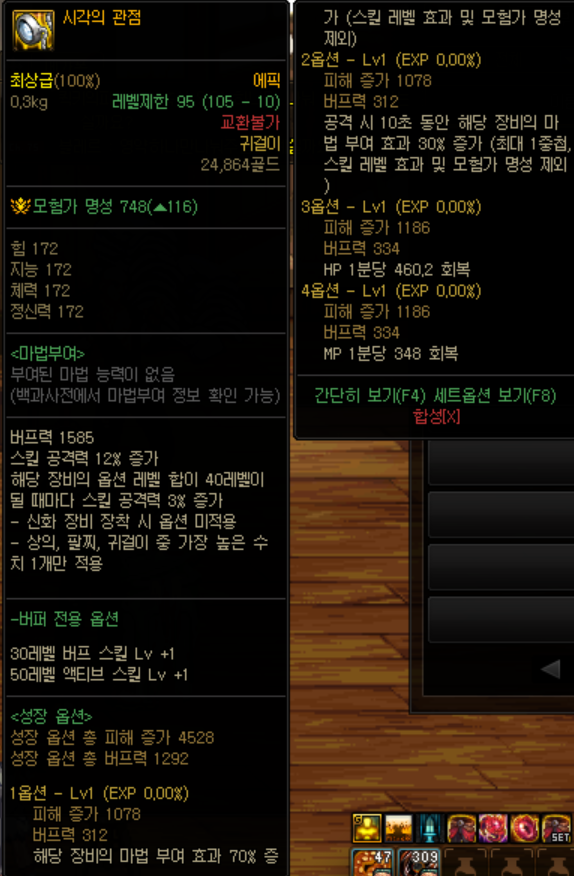 이 아이템 같은 경우에는 버프력을 제외한 다른 옵션은 축 버프레벨링 +3 각 레벨링 +2, 과 무기자체 지능뿐이라 비교가 수월했습니다.