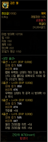 다른 105제 귀걸입니다. 기본 버프력은 차이가 없고 성장 옵션 버프력이 1324군요. 1레벨 기준 28의 차이를 보입니다.