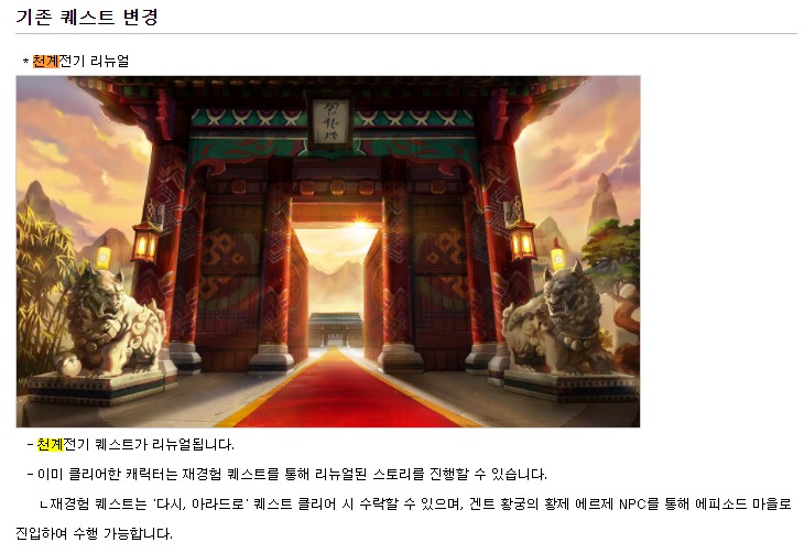 - 에피소드 [텅빈 황궁] 퀘스트가 천계 전기 액트 퀘스트에 포함됩니다.