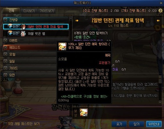보상이 무려 105레벨 랜덤 항아리(초반에 난이도 뚫으실 때 퀘스트 꼭 받고 도시길 추천드립니다.)