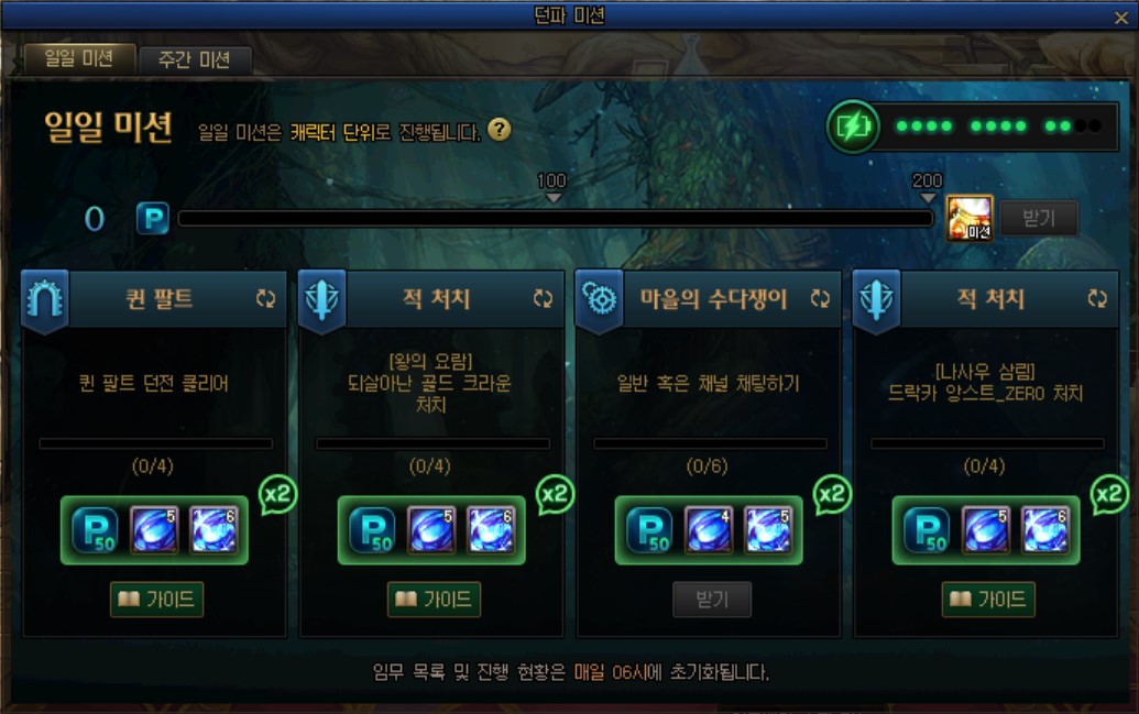 - 일일 미션은 매일 오전 6시에 초기화됩니다.
