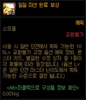 - 일일 미션 클리어 200포인트를 달성하게 되면 아래의 보상을 얻게 되며 교환불가 재료, 에픽, 카드 중 1개를 얻을 수 있습니다.