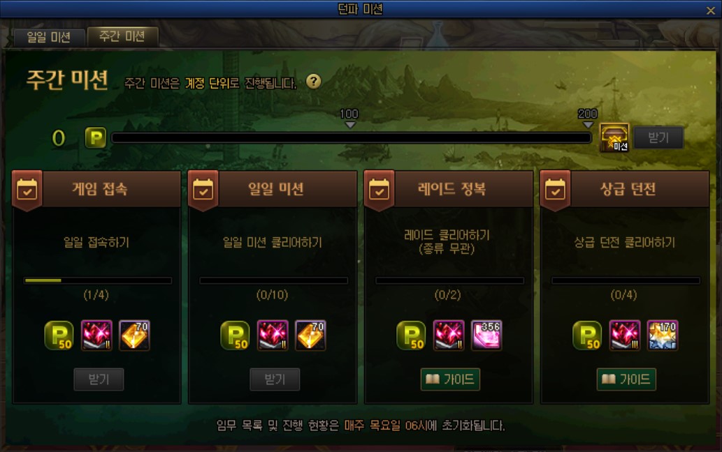 - 주간 미션은 매주 목요일 오전 6시 초기화됩니다.