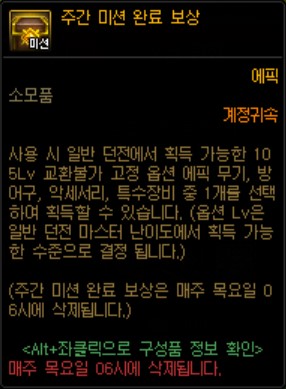 - 주간 미션 보상은 원하는 105제 에픽 중 한개를 선택하여 획득할 수 있습니다.
