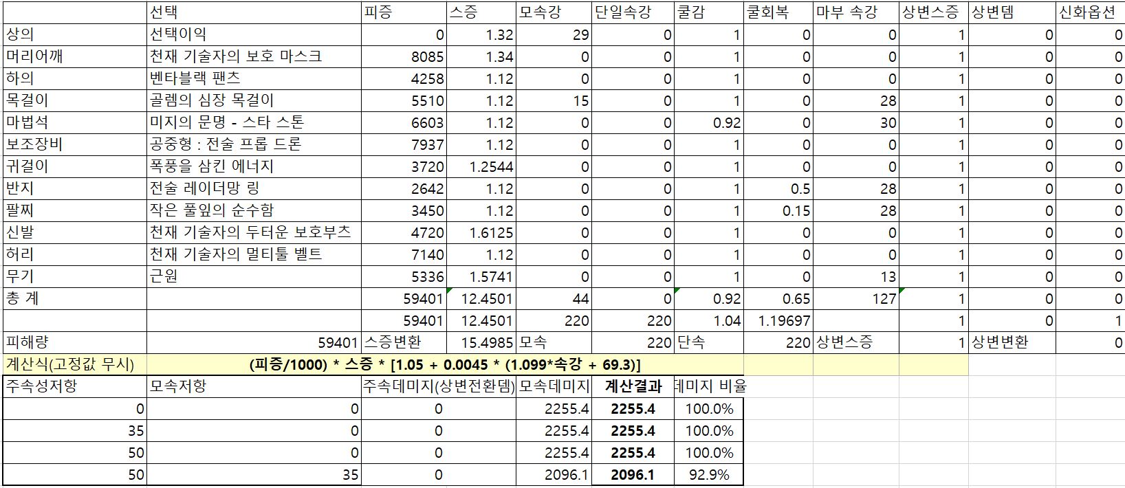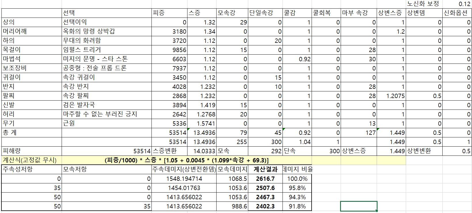 결과를 보시면, 이론적으로 모속기반에 마회템도 채용하지 않은, mp세팅과 비슷한 딜 기댓값을 보이며. mp회복을 위한 목걸이 /하의를 채용한 경우에는 압도 가능합니다.