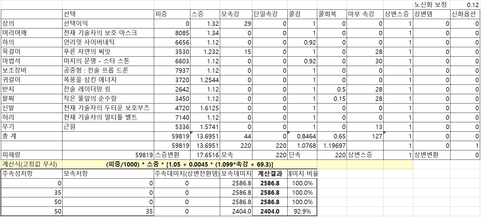 이런 식으로 천재기술자의 신발/벨트를 핵심 코어픽으로 하여, 높은 밸류의 반지인 레이더망 링을 추가적으로 채용하는 형태의 마나패널티 조합을 비교군으로 삼으려 합니다.
