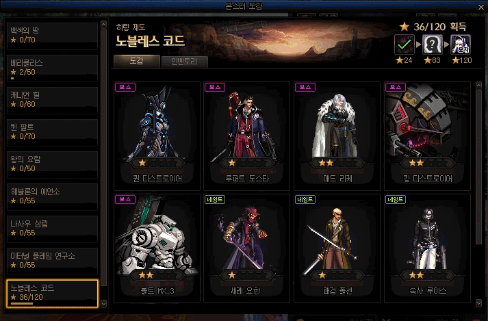 각 던전 탭에서 볼 수 있는 몬스터 도감 인벤토리를 확인하면