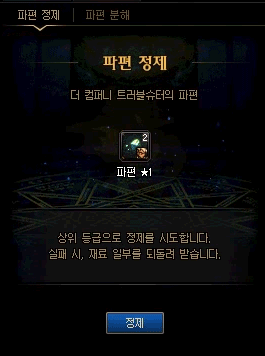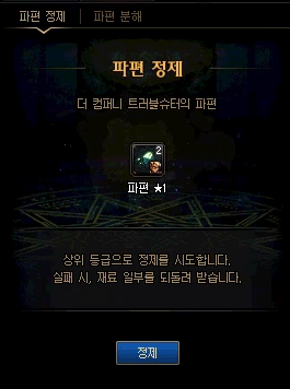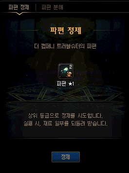파편 정제 하위 등급의 파편을 이용해서 상위 등급으로 정제를 시도하는 시스템 입니다. 파편 정제를 시도 시, 하위 등급 파편 2개를 사용합니다. | ||
