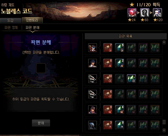파편 분해 상위 등급의 파편을 이용하여 하위 등급의 파편을 얻는 시스템 입니다. 상위 등급 파편을 하나를 사용하여, 하위 등급 파편을 무조건 하나를 획득 합니다. |