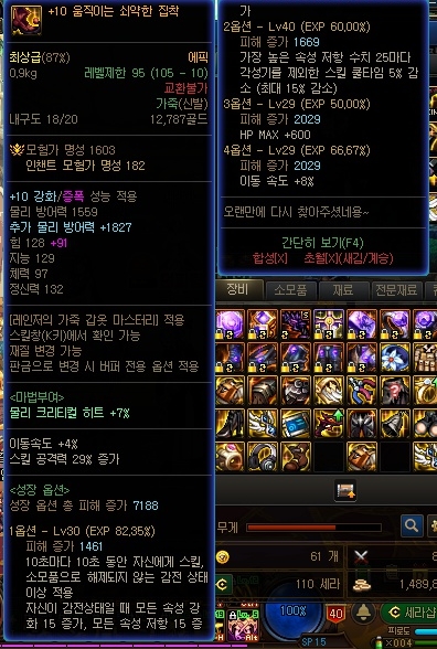 우측에 있는 장비들은 내가 실제로 착용하고 있는 장비이고