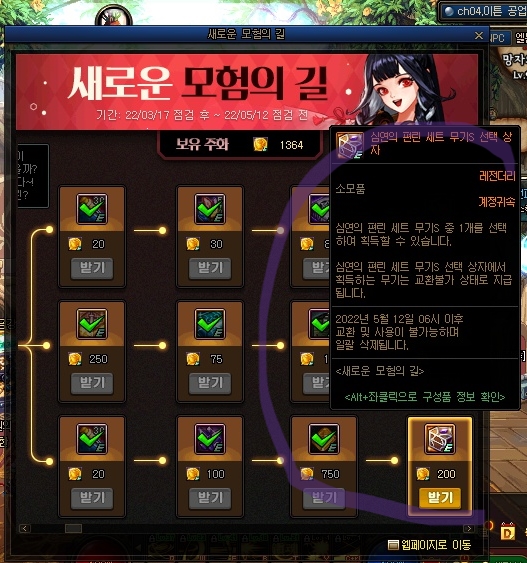 9월 29일 ~ 10월 27일 4주 이벤트만진의 항아리 이벤트 보상 정리만진의 항아리포킨의 항아리선배의 항아리코인 8개레미의 반짝이는 손길 30개데릴라의 수리 쿠폰 (전부위) 3개플레이 포인트 20골든 베릴 250개1회용 장비 옵션 레벨 성장권 8개1회용 장비 옵션 레벨 이관권 4개1회용 장비 옵션레벨완전성장권4개코인 8개레미의 반짝이는 손길 30개데릴라의 수리 쿠폰 (전부위) 3개폭풍의 역린 추가 입장권 6개노블레스 코드 (마스터) 입장권 5개파괴된 죽은 자의 성 (마스터) 입장권 5개마이스터의 실험실(마스터)입장권5개코인 8개레미의 반짝이는 손길 30개데릴라의 수리 쿠폰 (전부위) 3개플레이 포인트 20공명하는 불길한 수정 500개붉은 황혼의 수정 250개고효율 어비스 배터리 상자 175개이스핀즈/기계 혁명 에픽 장비 선택 상자 1개커스텀 에픽 장비 선택 상자 1개장비성장관련. 모두 얻는데에 60개 필요입장권관련. 모두 얻는데에 45개 필요에픽장비 및
