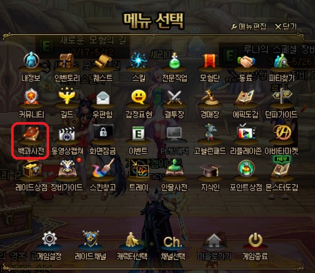일단 ESC를 살포시 눌러보시면 빨간 박스처럼 백과사전아이콘을 볼수 있습니다. 거기에 뭐가 있냐?