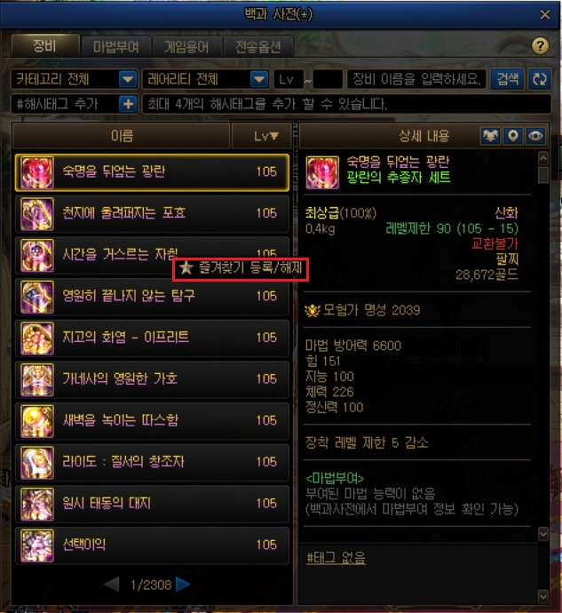 즐겨찾기를 할 경우 위 사진처럼 최상단으로 즐겨찾기한 아이템들이 정렬되어 확인이 편하니 자주 사용하세요.(그리고 템이 드랍되면 무려 찜빔이라는 어마어마한게 나옵니다)