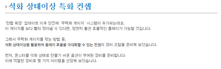 2. 석화의 특성상 데미지 감소가 붙어있는데 몹의 방어력을 높여주는 기이한 특성탓에 매우 꺼려짐.