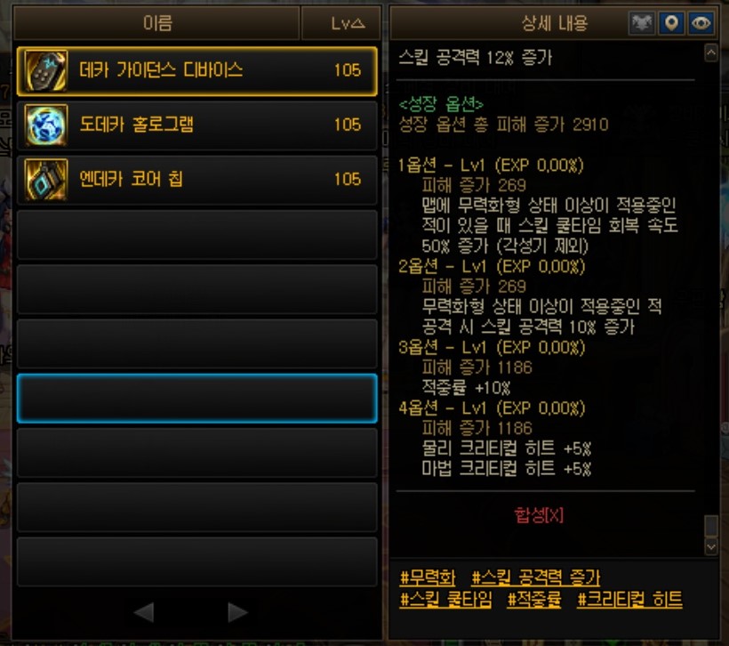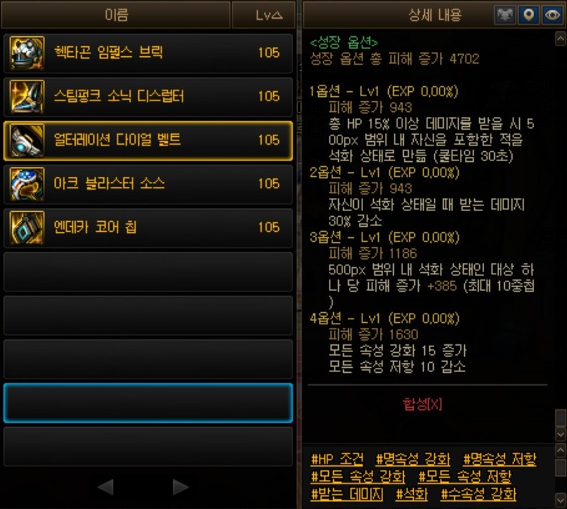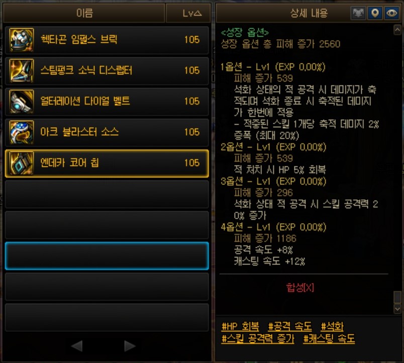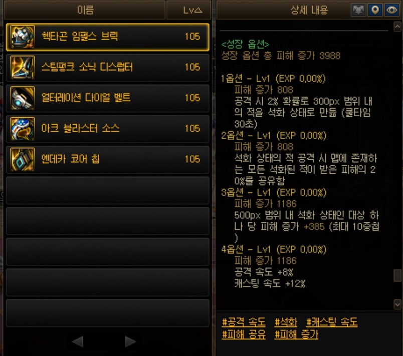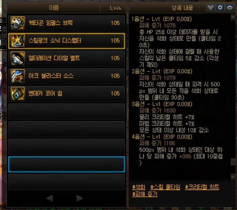백땅을 돌며 깨달은점: '피격 데미지 15프로 맞을 시 나와 적 석화 옵션'은 15프로 미만으로 다단으로 들어오면 안터진다.