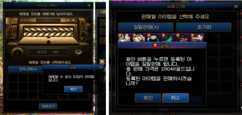 엘븐미어 시즌 보상으로 받은 성물 유니크 장비 및 에픽 장비들은 해체는 불가능하지만 판매는 가능합니다.
