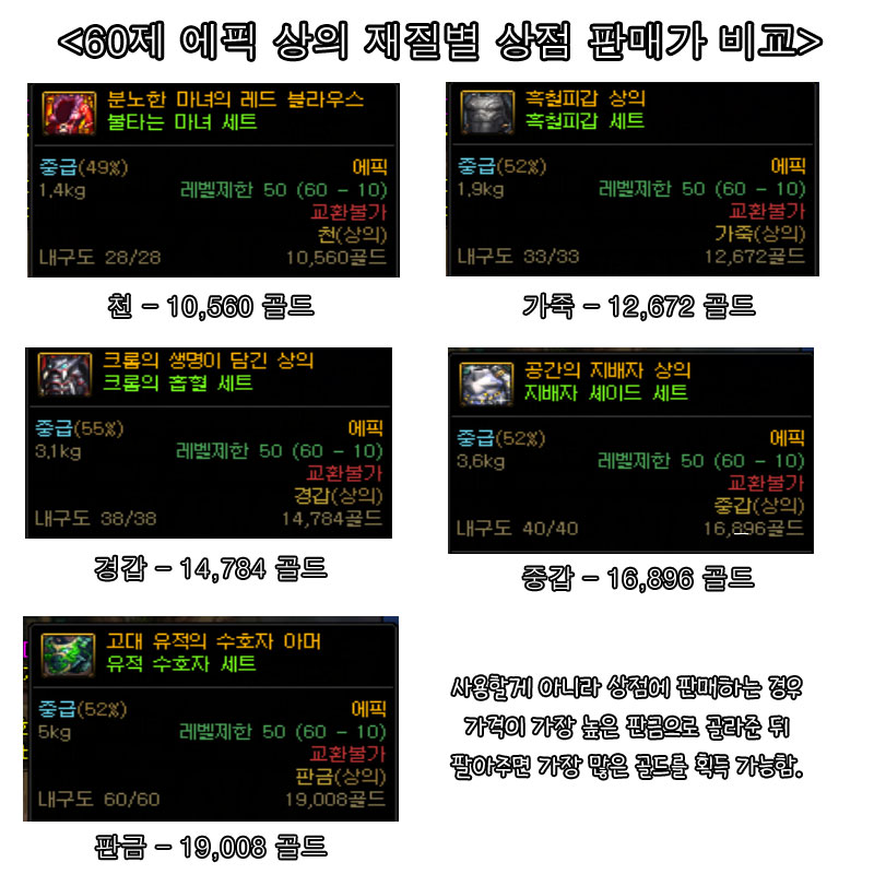 그리고 상점에 판매할 때 같은 레벨제한, 같은 부위일 때 재질에 따라 가격차이가 납니다. 판금>중갑>경갑>가죽>천 순으로 가격이 비싸며 따라서 판금으로 선택 후 판매하면 소소하지만 더 많은 골드를 획득할 수 있습니다.