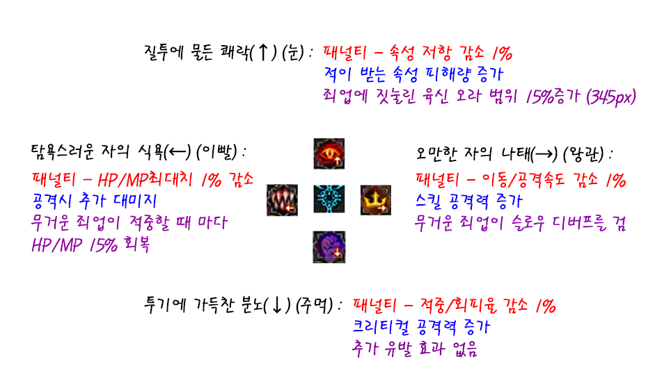 왕관: 패널티가 적은 수치로도 값어치가 높은 이동/공격속도라 1%로도 약간 따끔합니다. 추가효과가 무거운 죄업에 슬로우를 추가해 준다고 해서 '무력화 수치 더 잘깎겠지?' 하시겠지만, 무력화수치를 더 깎거나 하지는 않기에 별로 의미있는 효과는 아닙니다.