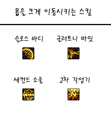 붉은색 사각형이 쳐진 스킬은 '비추천 스킬' 입니다. 롤링 러쉬와 사이드 매서커 둘 다 낫스킬이며, 시전시간이 길기에 추천드리지 않습니다.