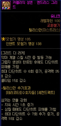 그리드 더 러커는 기본적인 성능이 굉장히 저열한 홀딩스킬이지만 그 탈리스만인 엔드리스 그리드는 스킬을 전부 적중시켜야한다는 단점을 제외하면 정말 압도적인 성능을 지닌 탈리스만입니다.