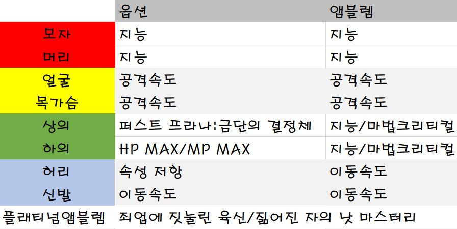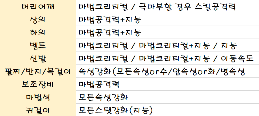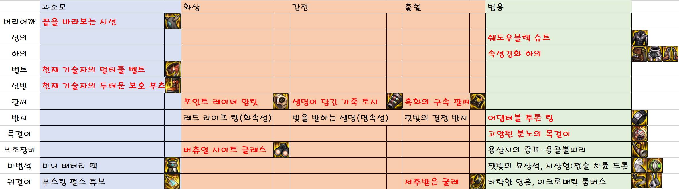 붉은색으로 표시된 장비는 해당 세팅에서 중요한 필수장비입니다.