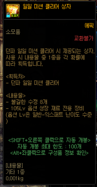 내용물이 불길한 수정에 105제 성장 재료 장비인데..... 32상자 중에 1개 나왔습니다...