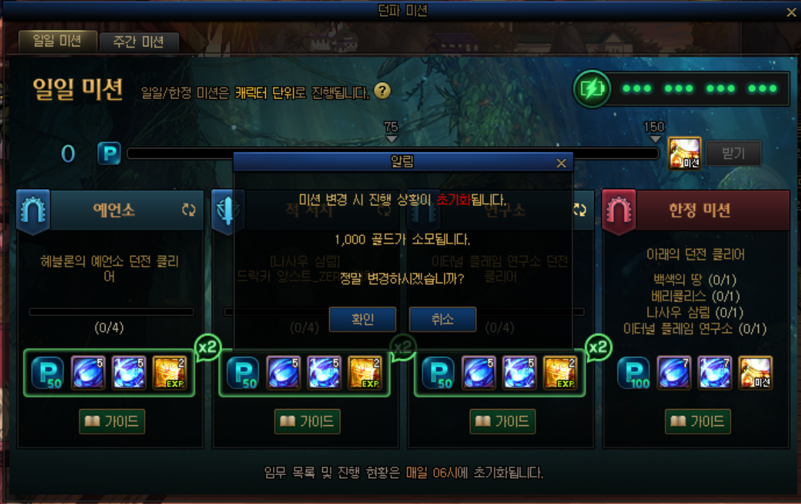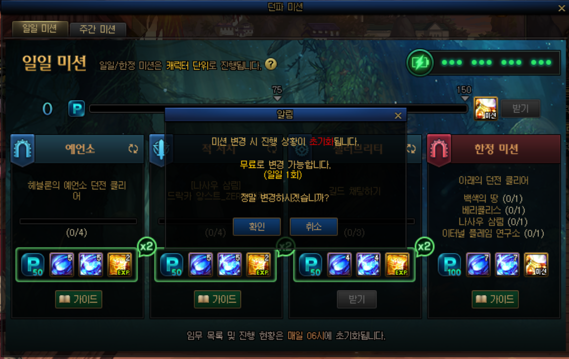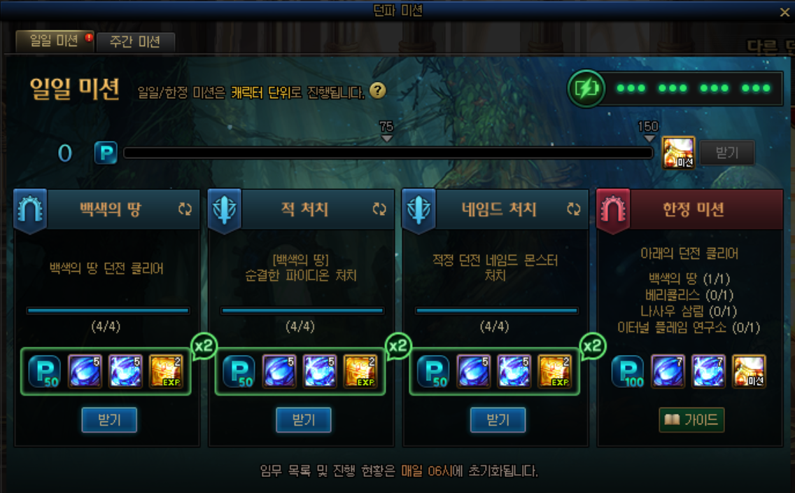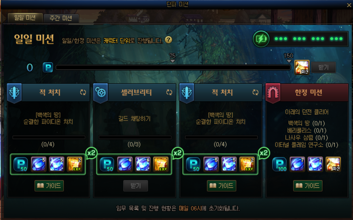일일 미션은 매일 06시 초기화이고 미션에 따라 보상이 달라집니다.