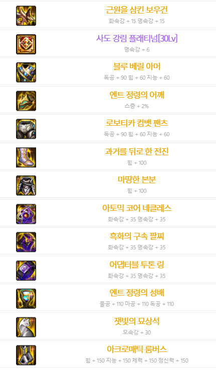 엔트정령어깨입니다. 코어옵션은 무색큐브조각을 소모하지 않는 스킬공격력 15%증가이며, 커맨드에 자신이 있다면 커맨드 스증도 좋습니다.