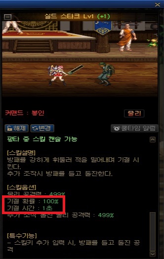 나이트 기본기 중 암흑과 기절을 확정으로 걸어주는 스킬이 있으니 (라이온 킥 51레벨 3.2초, 실드 스타크 1레벨 1초)