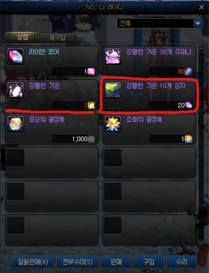 아래 전리품 상점에서 강렬한 기운을 판매 하고 있습니다.
