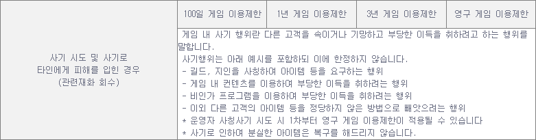 던파는 사기로 인한 피해는 온전히 게임을 즐기는 플레이어에게 문제가 있다고 생각합니다. 때문에 복구를 받을 수 없으며, 문의를 넣는다 한들 제대로 된 제재 또한 가하지 않습니다. 명확한 증거(스크린샷, 영상, 피해 기록)가 있지 않는 한 사기꾼은 제재 받지 않습니다.