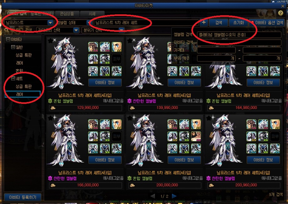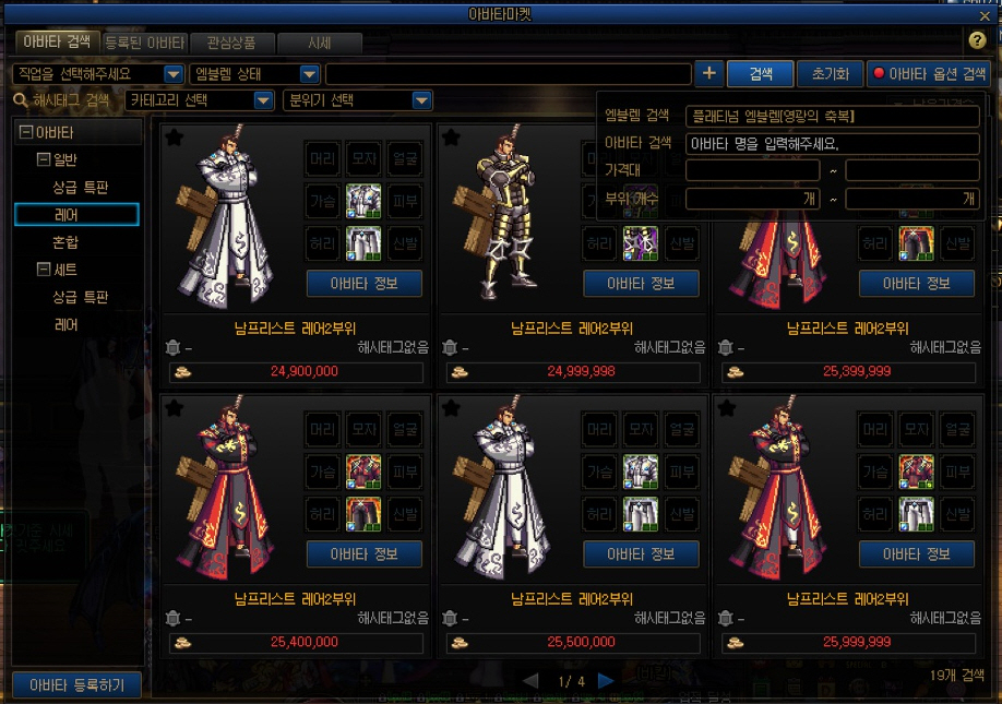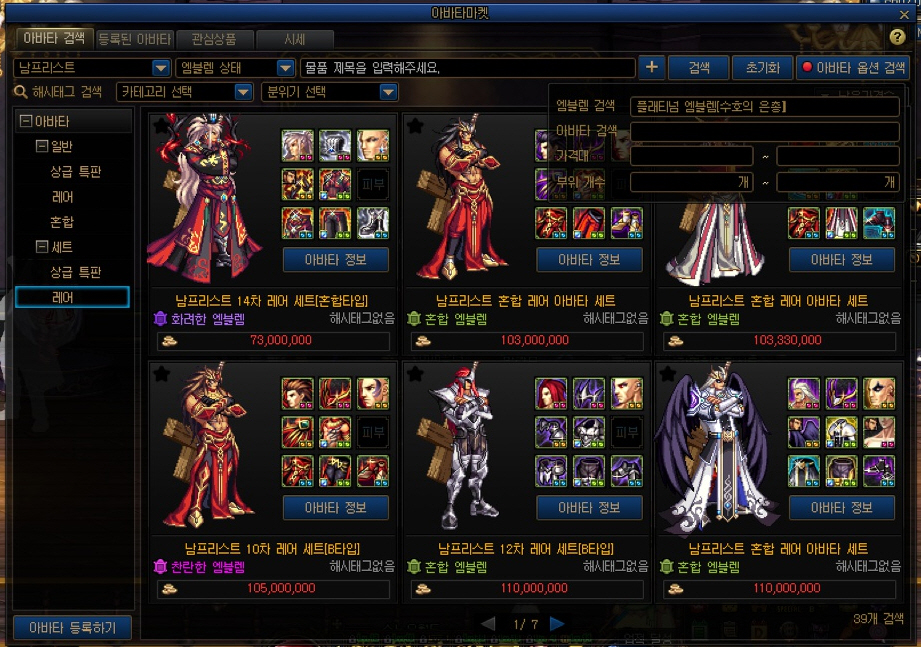 왼쪽 상단 직업칸에서 남프리스트 / 가운데 검색칸에 5차 레어 아바타 /