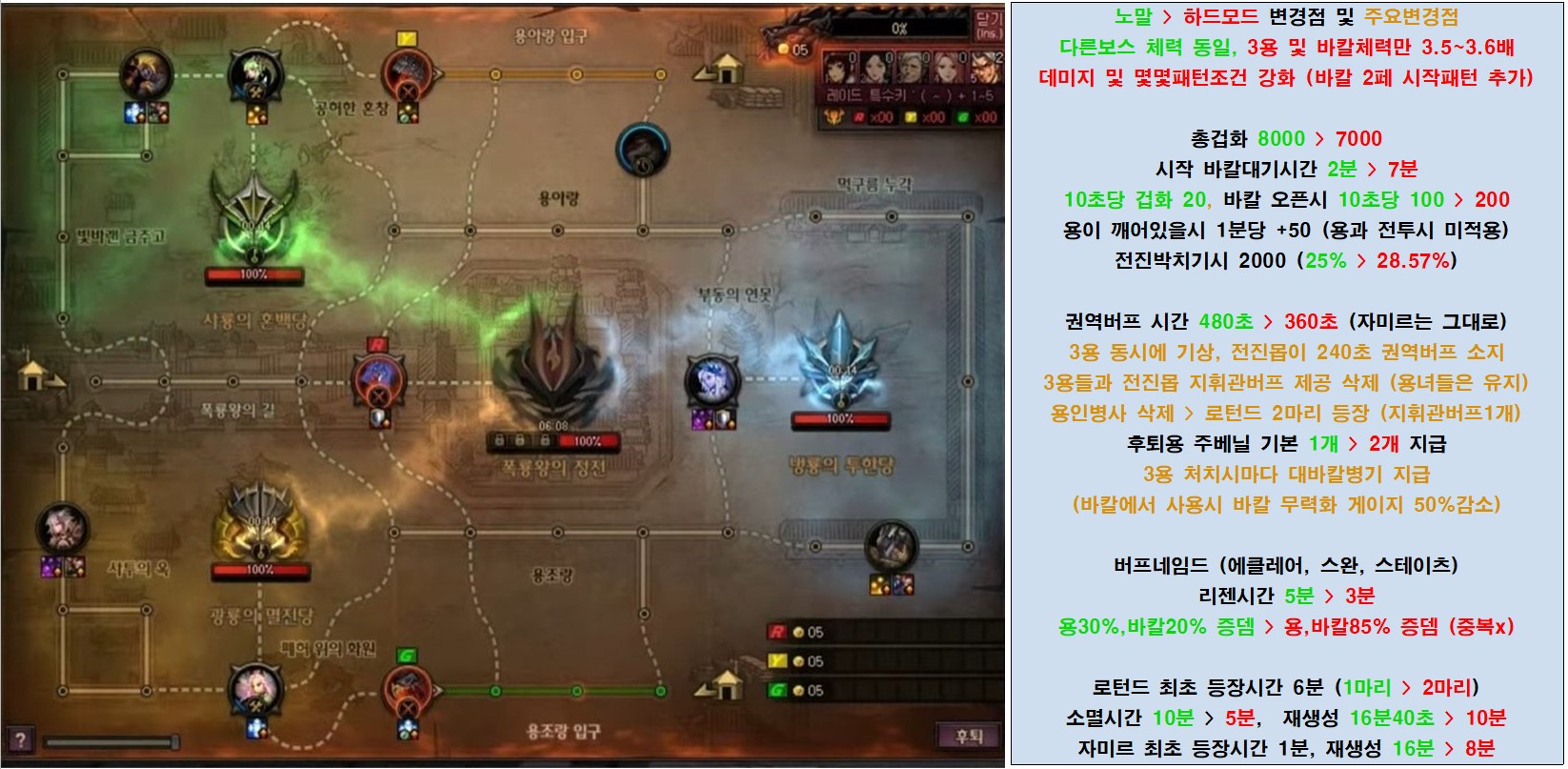 -삼룡이와 바칼의 피통은 늘었는데 권역버프의 시간은 줄어듦 ☞ 각 파티의 딜을 고려해서 용을 한 파티가 처리하기 보다는 2파티 가 교대로 잡는 형식을 기본으로 삼고, 딜이 충분하다면 360초안에 쓰러트리는 것을 고려해야 한다.