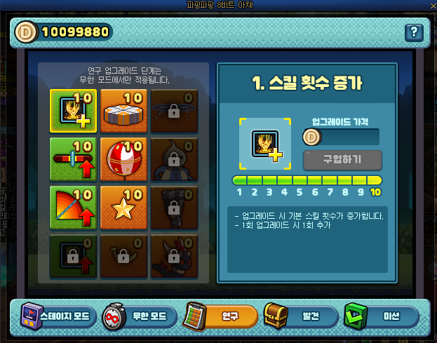 연구를 클릭하시면 돈을 모은것으로 업그레이드를 해 줍니다. (1주차에는 6개만 활성화되어 있습니다.)
