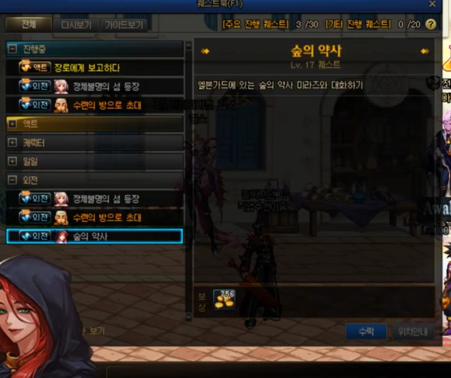 F1(퀘스트북)을 누르신 후, 외전에서 숲의 약사라는 퀘스트를 진행하면 입장하실 수 있습니다.