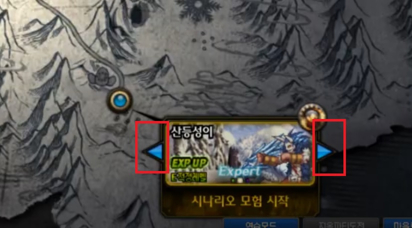 던전에 입장하기 전 파란색 화살표가 있는데 왼쪽 화살표 버튼을 누르면 난이도를 내리는 것이고, 오른쪽 화살표 버튼을 누르면 난이도를 올리게 됩니다. (혹은 키보드의 ←, → 로 난이도를 조정할 수 있습니다.)