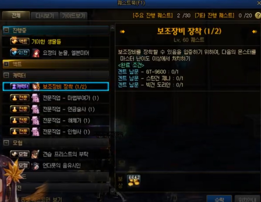 60레벨에 F1(퀘스트북)을 열어 '캐릭터' 카테고리에 들어가시면 보조장비 장착이 있습니다. (시스템에서는 설명이 별도로 없습니다.)