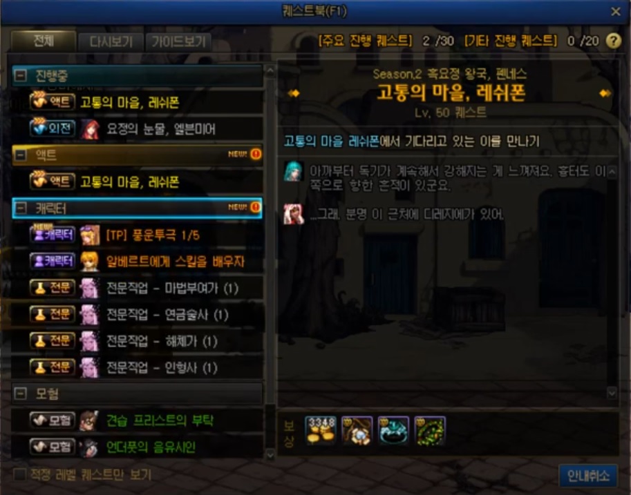 바로 '초붕'이라는 NPC가 직접 퀘스트를 홍보하는 것인데요, 해당 퀘스트는 F1(퀘스트북) - 캐릭터 카테고리 - [TP] 풍운투극 1/5에 해당됩니다.