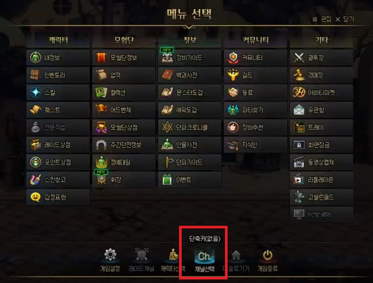 채널을 이동하는 방법은 던전이 아닌 마을에서 'ESC'를 눌러 '메뉴 선택'으로 들어가, '채널선택'을 마우스 왼쪽 버튼으로 클릭합니다.