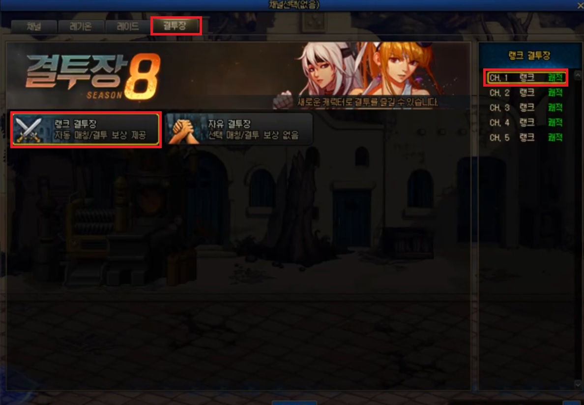 그 뒤에, '결투장' 카테고리로 들어가, '랭크 결투장' 채널은 CH. 1 ~ CH. 5 중 아무 곳에나 클릭하시면 됩니다.