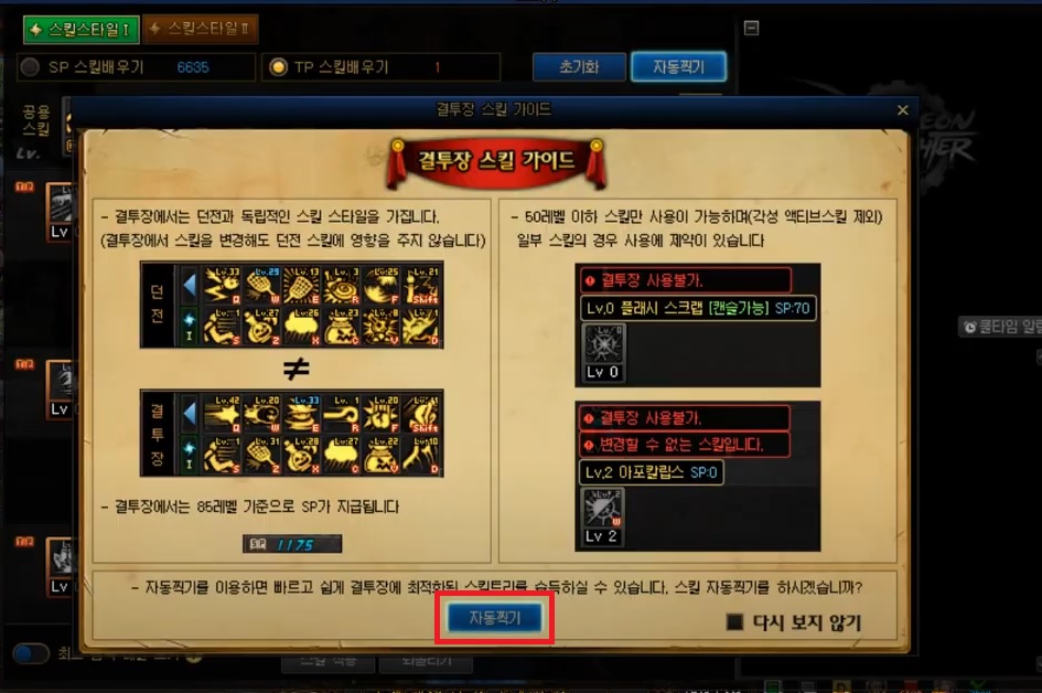 스킬은 자동찍기만 가능합니다. (즉, 스킬레벨은 조정할 수 없으며, 스킬창이나 커맨드는 편하신대로 변경이 가능합니다.)